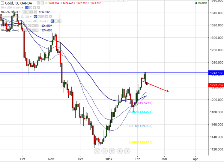 - The yellow metal declined sharply after hitting fresh three month high yesterday. Gold has fallen almost $20 from the high of $1244.80 on Trumps tax pledge and U.S rate hike expectations. It is currently trading around $1225.