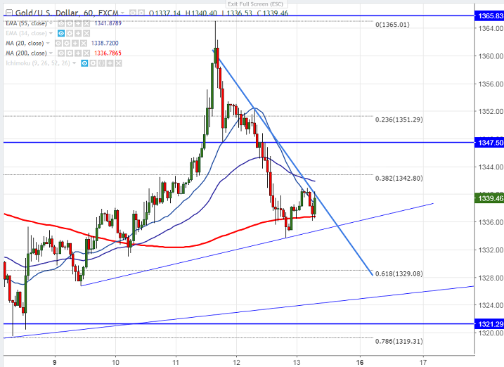 - On the lower side, near term support is around $1332 (20- day MA) and any break below will drag the yellow metal down till $1329 (61.8% fibo)/$1324.