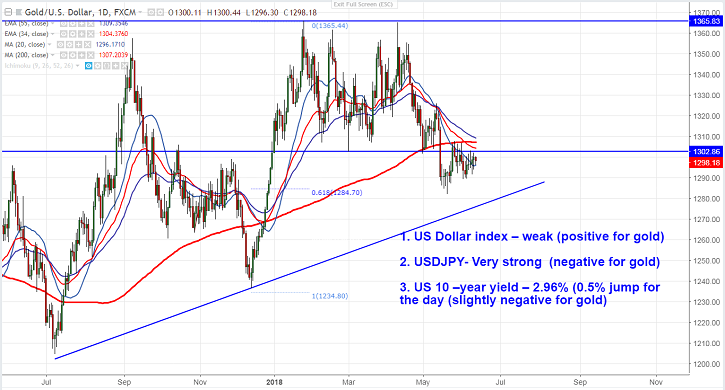 - Gold prices has shown a minor jump above $1308 and started to decline sharply from that level. US Donald Trump and Kim had a one to one meeting for 41 mins. Trump praises Kim and they have signed a document committing to work towards the complete denuclearization of the Korean peninsula. Markets eye US Fed policy meeting which is to be scheduled tomorrow. Any further rate hike will drag the gold prices further down. US 10 –year bond yield has slightly declined after hitting of 2.99%. USDJPY recovered sharply on easing geo political tension s between US and N.Korea. The pair jumped till 110.49 and is currently trading around 110.31. The yellow metal hits high of $1311 yesterday and is currently trading around $1298.02.
