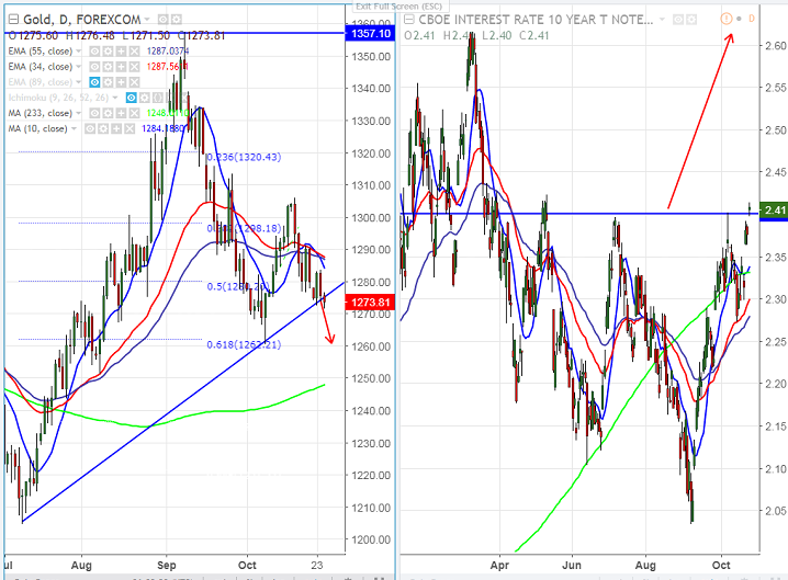- U.S 10 year yield has broken major resistance at 2.40% and this confirms minor bullishness a jump till 2.62% likely. Over the last month, the yield of USD has grown to six months high