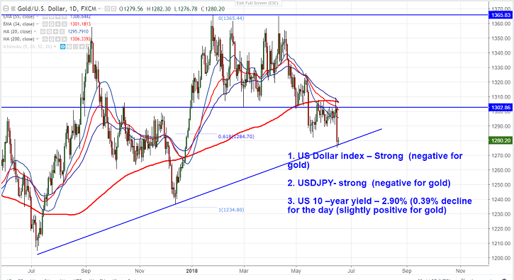 - Gold prices has declined sharply and hits 5- 1/2 month low on Friday on account of strong USD. US dollar index was trading higher as central bank ECB is planning to keep its rates on hold till summer 2019 and euro plunged to 2- week low.The slight divergence in Fed and ECB is dragging Euro lower. US 2 –year bond yield was trading slightly lower after hitting highest level since 2008 and 10 year yield declined slightly after hitting 3%. USDJPY jumped almost 100 pips from low of 109.91. It is currently trading around 110.44. The yellow metal hits low of $1275 yesterday and is currently trading around $1280.