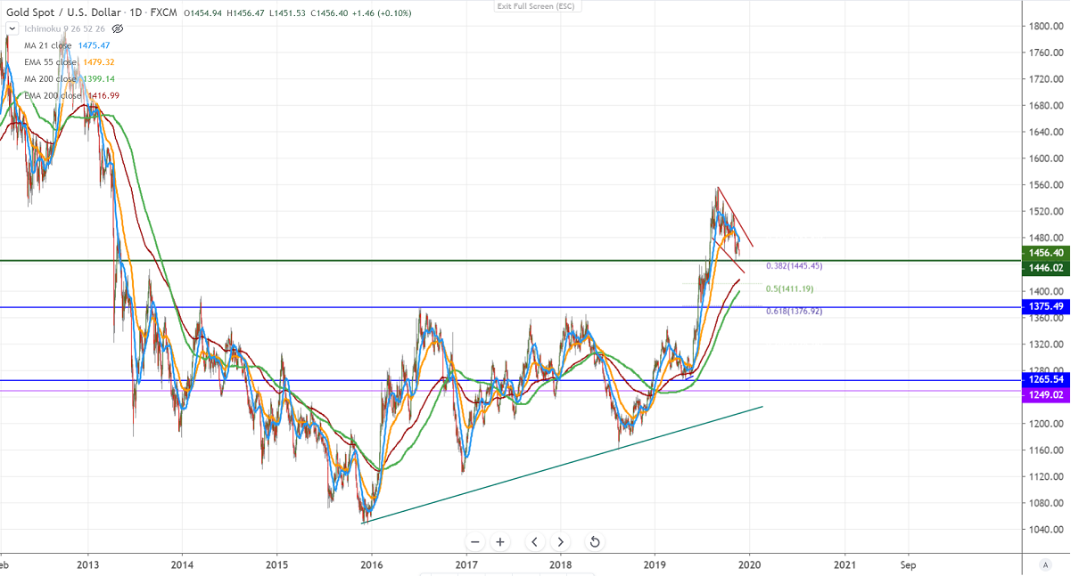 Gold continues to trade weak on US-China trade optimism. strong US dollar. China has drafted new guidelines for protecting intellectual property rights which increases hopes of phase 1 deal. The US dollar index has once again declined slightly after hitting a high of 98.40. It has formed double top around 98.45 and further minor jump can be seen only above that level.T he yellow metal hits low of $1451.50 and is currently trading around $1455.