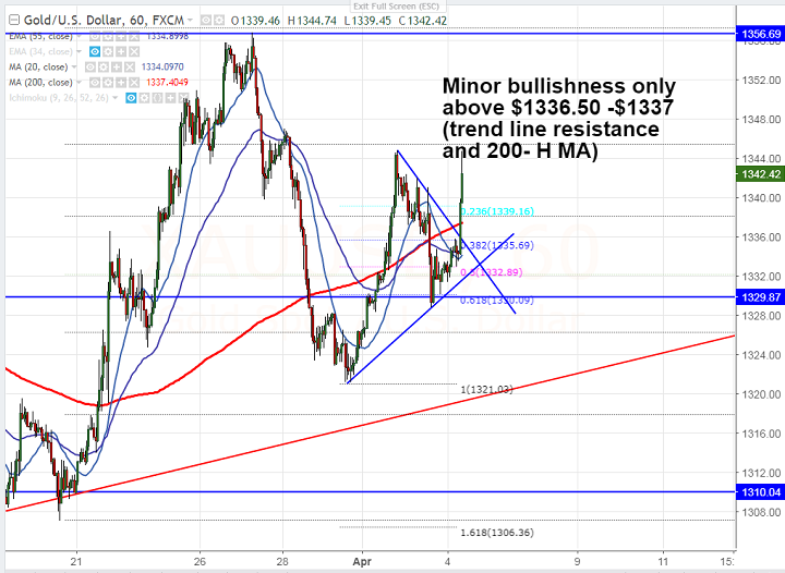 - The yellow metal is facing major resistance at $1347 and any minor bullishness only above that level. Any break above $1347 will take the gold till $1355/$1361 Overall bullish continuation only above $1362. The minor resistance is at $1337.50/$1341.