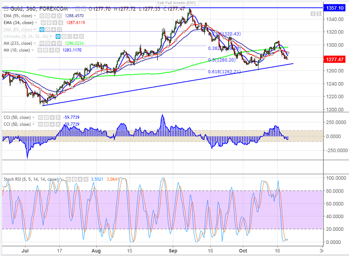 - Gold’s near term support is around $1269 (trend line support) and break below will drag the commodity down till $1262 (61.8% retracement of $1204 and $1357.90).The yellow metal should close below $1250 for major trend reversal.