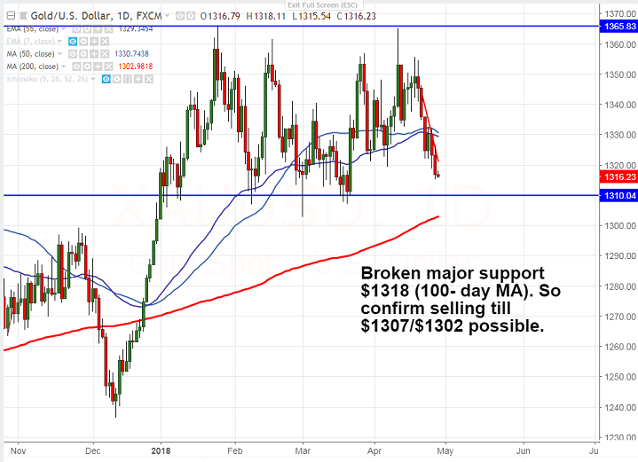 - On the lower side, near term support is around $1318 (100- day MA) and any break below will drag the yellow metal down till $1308/$1303 (200- day EMA).