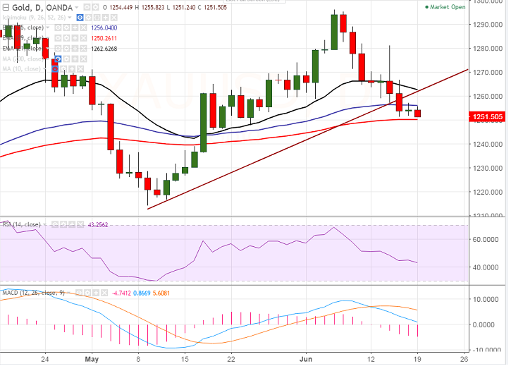 - In the daily chart , gold’s near term support is around $1250 (89-EMA) and break below will drag the commodity down till $1240 (200- MA)/$1229 (38.2% retracement of $1126 and $1296).