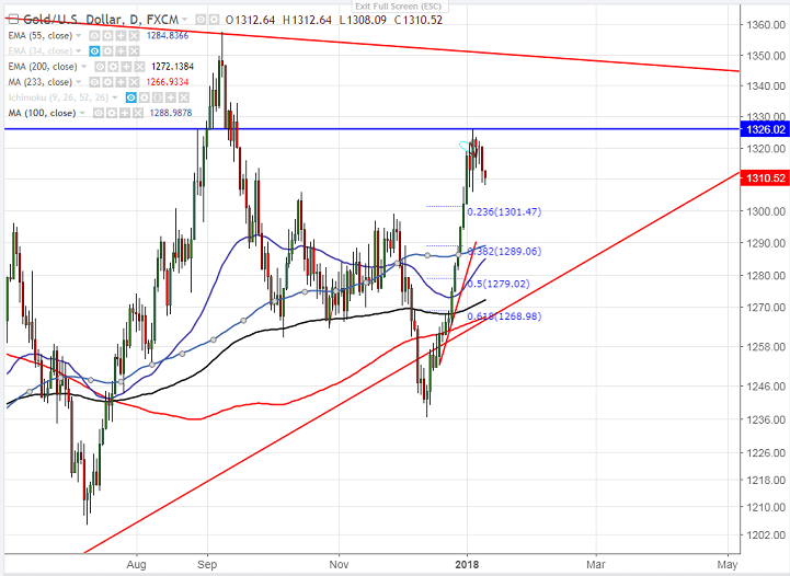 - On the higher side, gold is facing strong resistance at $1325 (127.2% fibo) and any break above will take the yellow metal till $1330/$1339 (161.8% retracement).