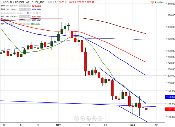 - Gold continues backslide after price notched 10 –month low on Monday. The yellow showed a mild jump till $1175 and once again started to fall from that level. The yellow metal is trading weak on account of strong U.S dollar and Fed rate hike fears.