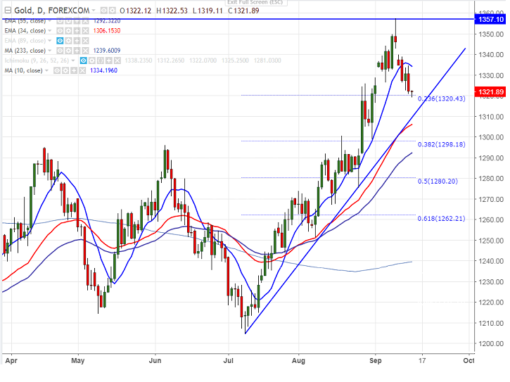 - Gold continuing its losing streak for fourth consecutive days after hitting year high at $1358 on account of surging U.S dollar and geopolitical tensions eases. The yellow metal jumped almost $40 from the high of $1358.It is currently trading around $1321.62.