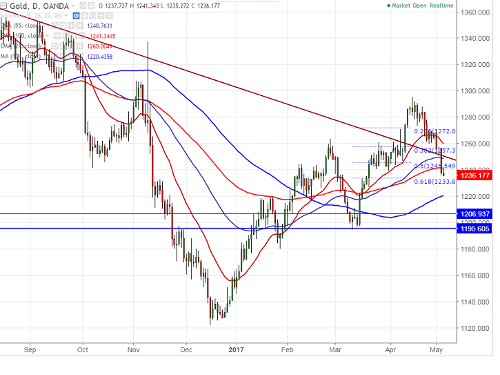 - Technically gold is facing strong support at 61.8% retracement (61.8% retracement of $1295 and 1195) and any break below will drag the yellow metal down till $1219 (100 – day MA). It should break below $1195 (Mar 10th 2017 low) for further weakness.