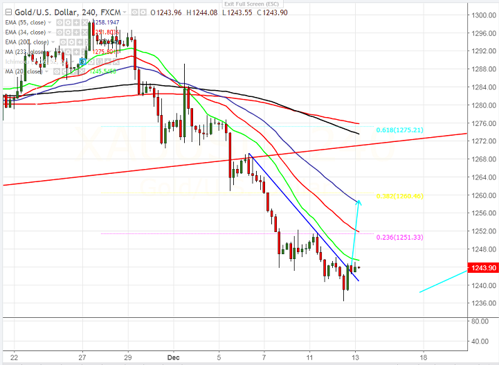- On the higher side, near term resistance is around $1251 (23.6% retracement of $1299 and $1240.26) and any break above will take the yellow metal to next level till $1260/$1269 (200- day EMA).