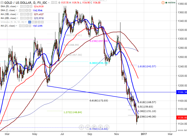 - Technically Gold is facing minor resistance at $1145 (7- day EMA) and any break above will take the pair till $1156 (10- day MA)/$1174 (21- day MA). The yellow metal should close above 21- day MA ($1174) for further jump till $1188 (Dec 4th 2016 high)/$1197.