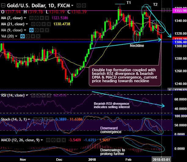 While on daily terms, the double top formation is spotted out with top 1 at 1365.95 and top 2 at 1344.62 and neckline at 1306.40 levels. This bearish pattern is coupled with shooting star that has occurred at 1347.60, bearish RSI divergence and bearish DMA & MACD crossovers.
