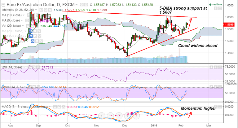 - The pair has strong support at 1.56 levels (5-DMA) and we see major weakness only on breaks below 1.5500 (10-DMA).