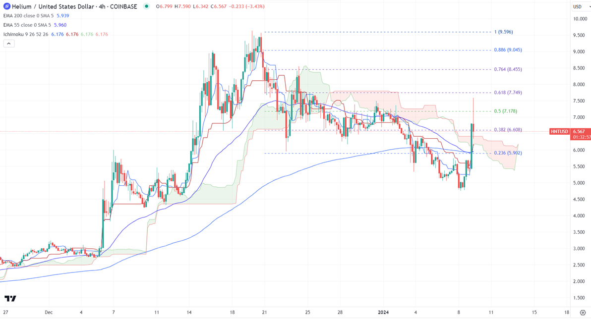 HNTUSD lost more than 50% after forming a minor top around $9.63. The pair holds well above the short-term (21 and 55 EMA) and long-term moving average. It hit a high of $7.59 and is currently trading around $6.370.