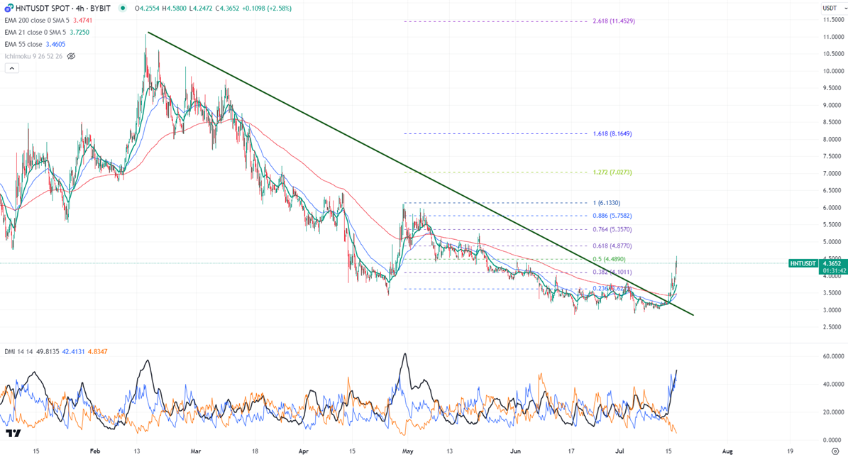 HNTUSD gained more than 55% in past ten days. The pair holds well above the short-term (21 and 55 EMA) and long-term moving average. It hit a high of $4.58 and is currently trading around $4.35.