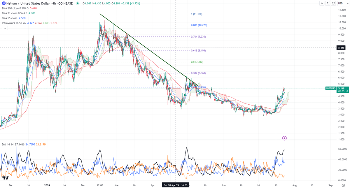HNTUSD gained more than 80% in past two weeks. The pair holds well above the short-term (21 and 55 EMA) and long-term moving average. It hit a high of $4.58 and is currently trading around $4.35.
