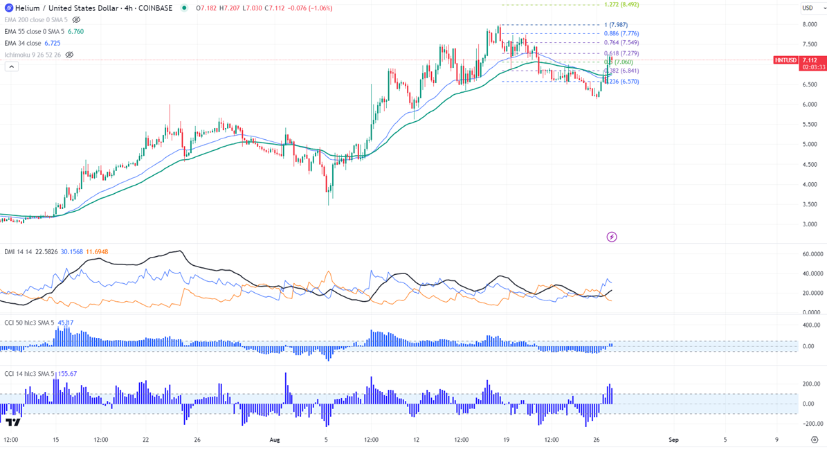 HNTUSD gained more than 18% in the past two days. The pair holds well above the short-term (21 and 55 EMA) and the long-term moving average. It hit a high of $7.24 and is currently trading around $7.10.