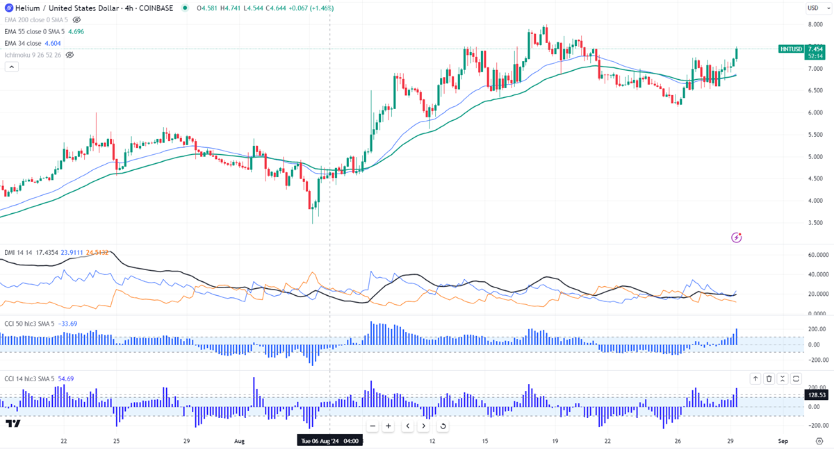 HNTUSD gained more than 10% in the past two days. The pair holds well above the short-term (21 and 55 EMA) and the long-term moving average. It hit a high of $7.50 and is currently trading around $7.454.