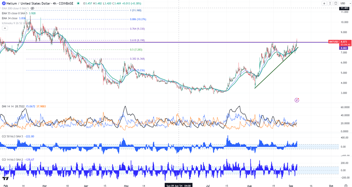 HNTUSD breaks significant resistance of $8 after a long consolidation. The pair holds well above the short-term (34 and 55 EMA) and the long-term moving average in 4-hour chart. It hit a high of $8.36 and is currently trading around $8.04.