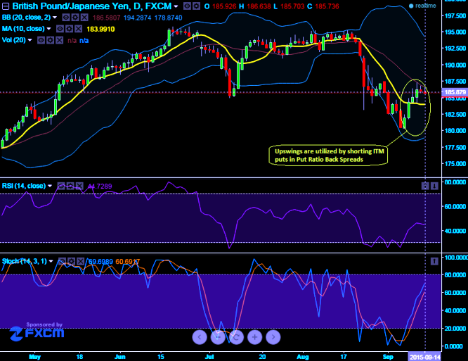 Short term ITM shorts are exactly suitable for short term upswings that have begun from last 4-5 days, expect the underlying currencies GBPJPY in this case to make a large move on the downside. So, purchase 2 lots of At-The-Money -0.50 delta puts and sell one lot of (1%) In-The-Money put option, use expiries suitable to the individual circumstances.