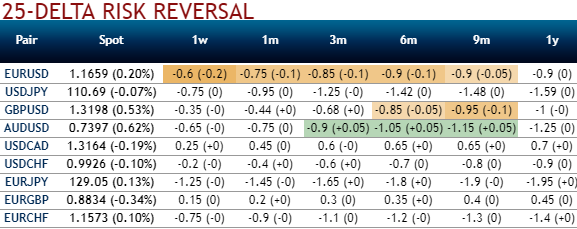 OTC outlook: The positively skewed IVs of EURUSD of 1m tenors signify the hedging interest of bearish risks, while mounting bearish risk sentiment is substantiated by increased negative risk reversal numbers.