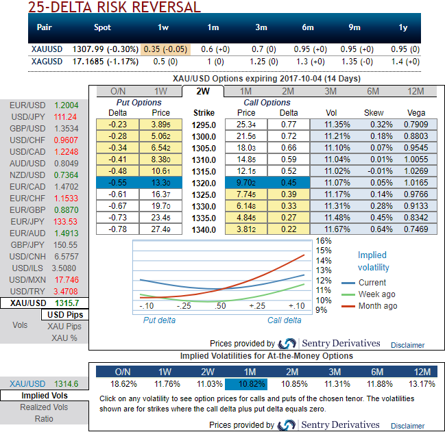 The implied volatility of 1m XAUUSD ATM contracts is a tad below 11%, (10.82% to be precise), while the skews in these IVs signify the hedging sentiment through OTC market has been well balanced for both bullish and bearish risks ahead of Fed’s funds decision.