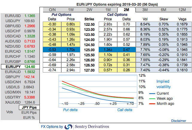 Options Trade Tips (EURJPY): Buy 2m EURJPY (1%) ITM -0.69 delta puts for aggressive bears on hedging grounds. If expiry is not near, delta movement wouldn’t be 1-point increase with 1 pip in the underlying spot FX. Which means if the spot FX moves 1 pip, depending on the strike price of the option, the option would also move less than 1. Thereby, in the money put option with a very strong delta will move in tandem with the underlying. Source: Sentrix, JPM and Saxo bank