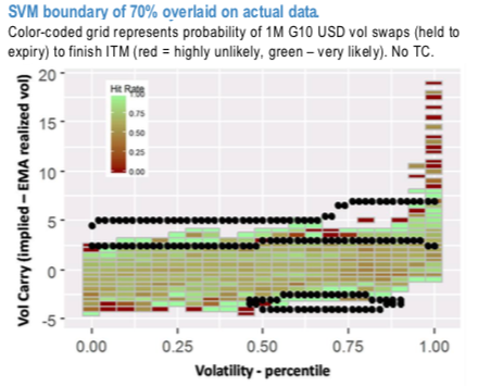 1M volatility selling P/L hit rate is represented as color-coded cells in the Percentiles (implied vol) - Vol carry grid in 1stchart with the dotted black line demarking the machine learning model implied regions of favourable vol selling (the island on the bottom and the stripe across). SVM (support vector machine), a supervised machine learning model, was used to model the 1stchart non-linear decision boundary.