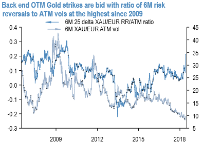 Reminiscent of poor EUR sentiment topside OTM Gold strikes got bid to the highest level since 2009 (in terms of the ratio of 6M risk reversals to ATM vols) (refer 1st chart).