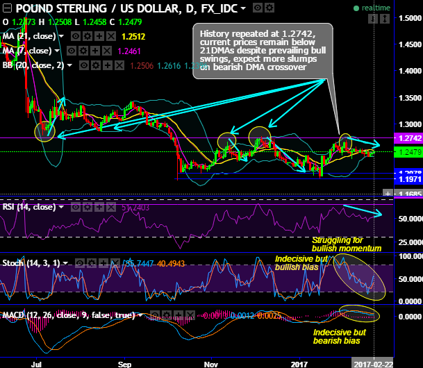 On daily charts, the bears manage to slide below 21DMA after the rejection of stiff resistance of 1.2742 levels; the current prices remain well below 21DMAs despite the spikes from last two days. Today again bears resume at 21DMA with confirmation from momentum indicators for selling sentiments.