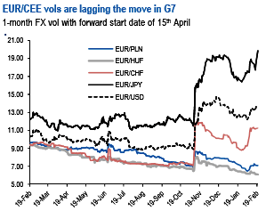 While G7 currency pairs, including EURUSD, EURJPY, and EURCHF have been moving higher in anticipation of French election risks, EURPLN and EURHUF implied volatility has been grinding lower.