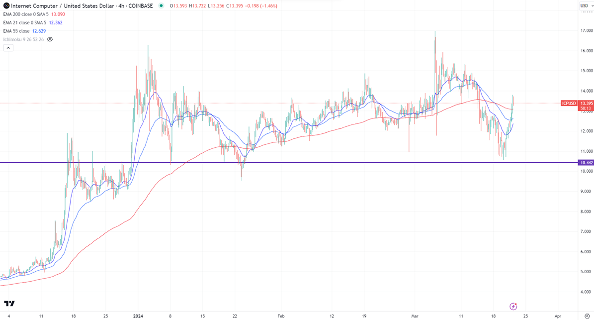 ICPUSD jumped more than 30% from the low of $10.56.The pair holds well above the short-term (21 and 55 EMA) and long-term moving average. It hit a high of $13.79 and is currently trading around $13.39.