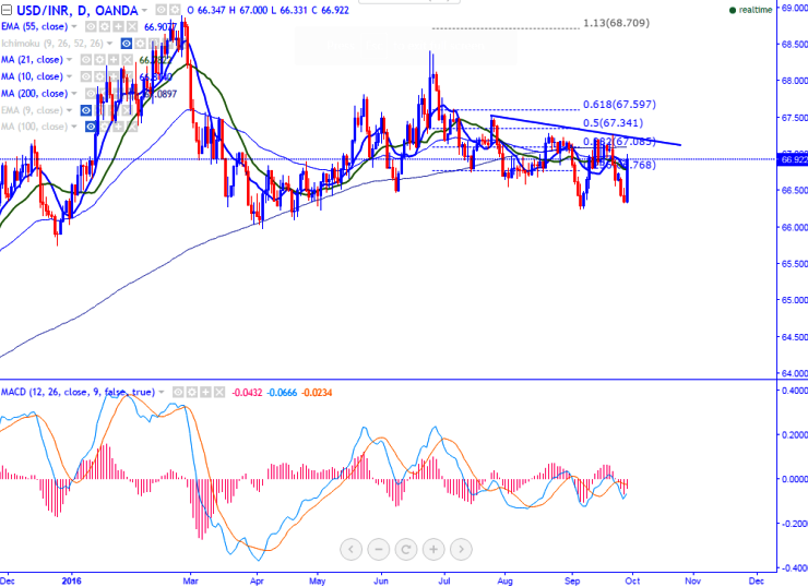 - USD/INR jumped sharply from the low of $66.33 till $67. It is currently trading around $66.95.