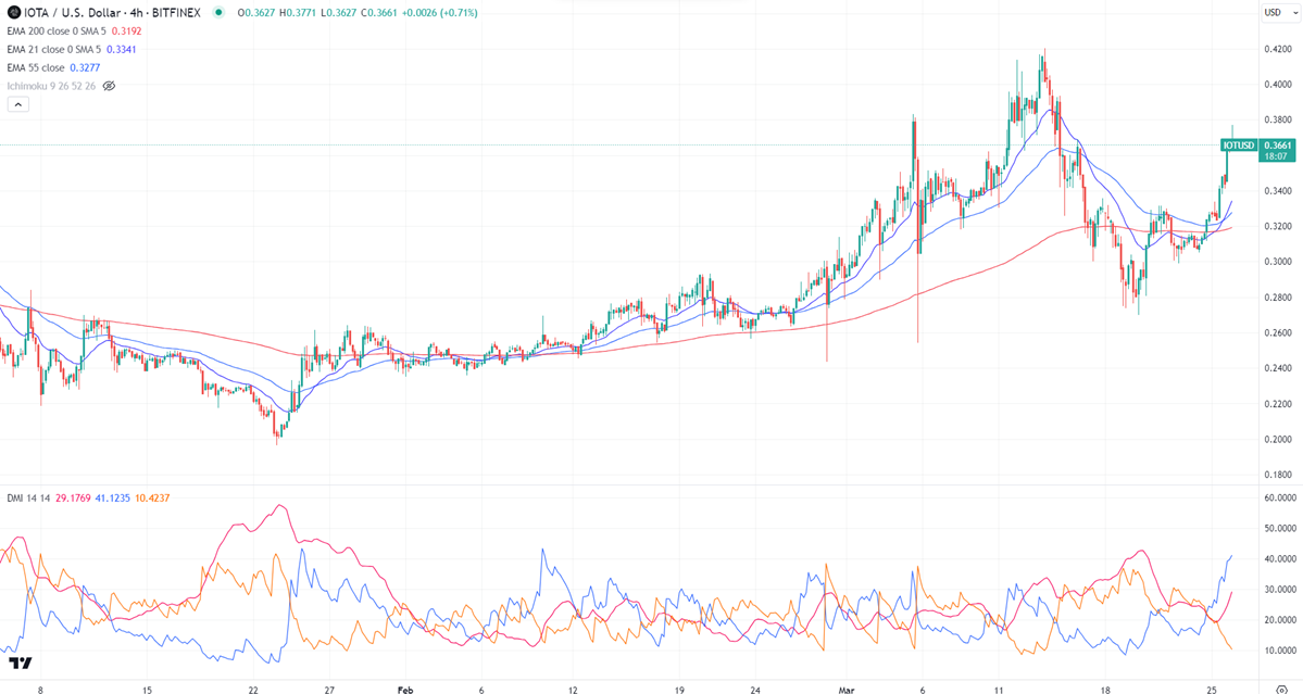 IOTUSD jumped more than 35% in the past five days. The pair holds well above the short-term (21 and 55 EMA) and long-term moving average. It hit a high of $0.3770 and is currently trading around $0.3681.