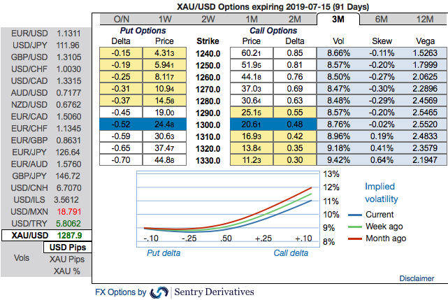 Options Strategy: Contemplating the prevailing dips of gold price in the short-run and OTC indications, bullish neutral risk reversals of gold, longs in gold via ITM call options look to be attractive.