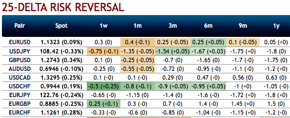 EURCHF bearish neutral risk reversal numbers and positively skewed of implied volatilities of 3m tenors signify the bearish risks to prevail further (refer 1stand 2ndexhibits). 25-delta risk reversals indicate the difference in volatility, and therefore price, between puts and calls on the most liquid out-of-the-money (OTM) options quoted on the OTC market. Negative bids indicate puts are more expensive than calls (downside protection is relatively more expensive).