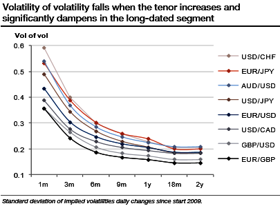 The volatility of volatility of our eight pairs is represented on Graph for tenors from 1m to 2y. For each pair, we observe the suspected decreasing relationship between the tenor and the instability of the implied volatility. Since 2009, GBP volatilities have been the more stable, while the most volatile have been JPY and AUD/USD volatilities.