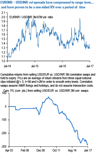 Risk reversals are even better placed than ATMs to play the RV since EURINR skews are marked 0.4-0.5 vols under USDINR skews across the curve even after the recent uptick in EUR-cross riskies; we advocate a reduced form expression of the skew RV via EUR call/INR put –USD call/INR put switches that are 0.3-0.4 vol discounted vis-à-vis ATM strikes.