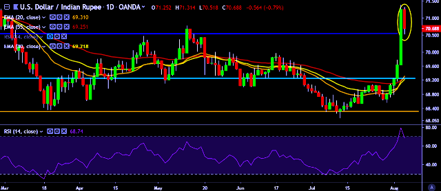 - USD/INR is currently trading around 70.70 marks.