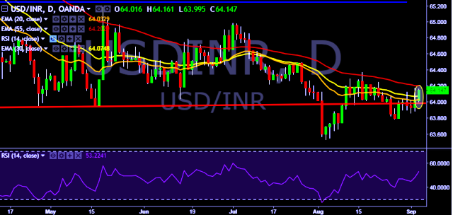 - USD/INR is currently trading around 64.13 marks.