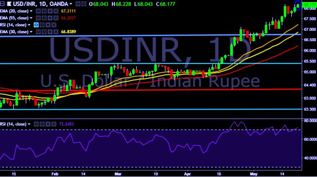 - USD/INR is currently trading around 68.16 marks.