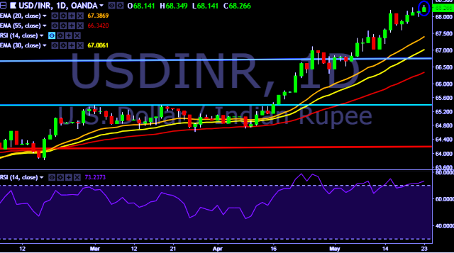 - It made intraday high at 68.34 and low at 68.14 marks.