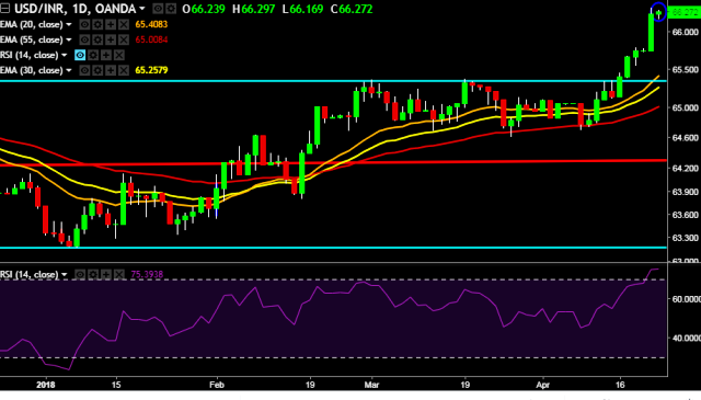 We prefer to take long position in USD/INR around 66.20, stop loss at 65.98 and target of 66.48/66.67.