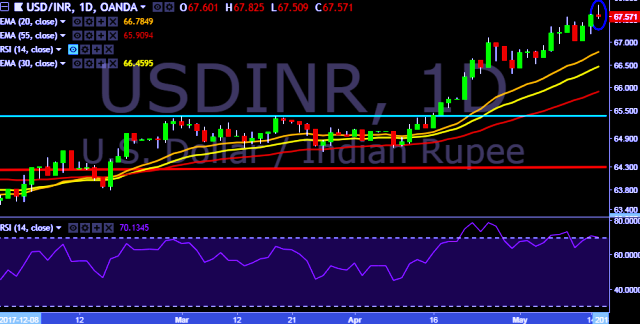 We prefer to take long position in USD/INR around 67.50, stop loss at 67.15 and target of 68.21/68.50.