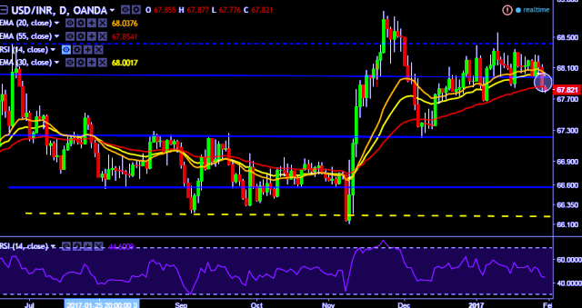 We prefer to take short position on USD/INR around 67.85, stop loss at 68.14 and target of 67.67/67.50.