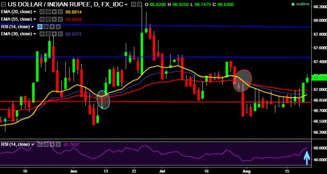 We prefer to take long position in USD/INR only above 67.22, stop loss at 66.82 and target of 67.52.