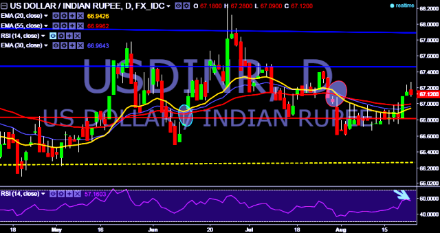 We prefer to take short position in USD/INR only below 67.05, stop loss at 67.32 and target of 66.82.