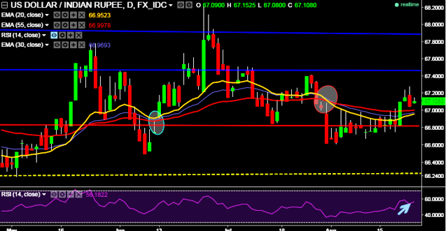 We prefer to take short position in USD/INR only below 67.05, stop loss at 67.32 and target of 66.82.