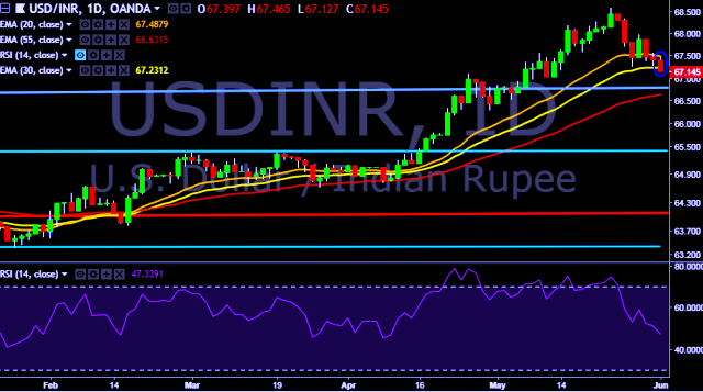 - Key resistances are seen at 67.55, 67.97, 68.10, 68.50, 68.68, 68.83 and 68.98 marks respectively.